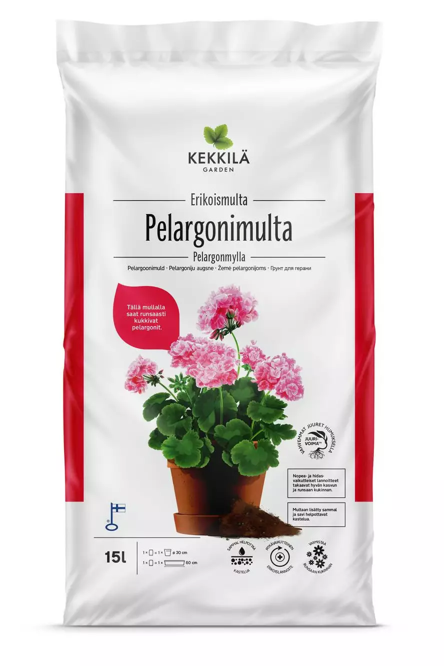 Pelargonit viihtyvät parhaiten aurinkoisessa ja lämpimässä paikassa. Pelargoneille on tärkeää, että multa saa kuivahtaa kastelukertojen välillä. Valitse riittävän iso ruukku, jossa pelargoneilla on tilaa kasvaa. Levitä ruukun pohjalle 2–5 cm kerros Kekkilä Ruukkusoraa. Kaada Pelargonimultaa suoraan ruukkusoran päälle. Istuta pelargonit, painele multa kevyesti juuripaakkujen ympärille. Jätä ruukun reunan ja multapinnan väliin pieni kasteluvara, jotta kasteluveden imeyttäminen on helpompaa. Kastele istutus niin, että multa kastuu kokonaan. Kasvukauden aikaiseen lannoittamiseen sopii kasteluveteen sekoitettava Kekkilä Kesäkukkaravinne.