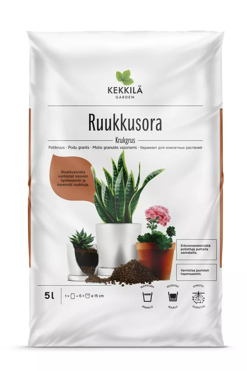 Kekkilä Ruukkusora on erikoismenetelmällä poltettua savea. Se ei sisällä ravinteita eikä liukene veteen. Ruukkusora sopii mullan keventämiseen ja ilmastoimiseen. Ruukkusoralla tehty salaojitus varmistaa juuriston hyvinvoinnin estäessään mullan liiallisen vettymisen. Ruukkusora ei varastoi vettä, joten sen voi myös sekoittaa mullan sekaan, jolloin kasvualustasta tulee ilmava ja kevyt. Ruukkusoran avulla on helppo keventää isojen ruukkujen painoa. Käyttökohteet Ruukkujen salaojitus, kasvualustan keventäminen, mullan pinnan viimeistely, vesiviljely.